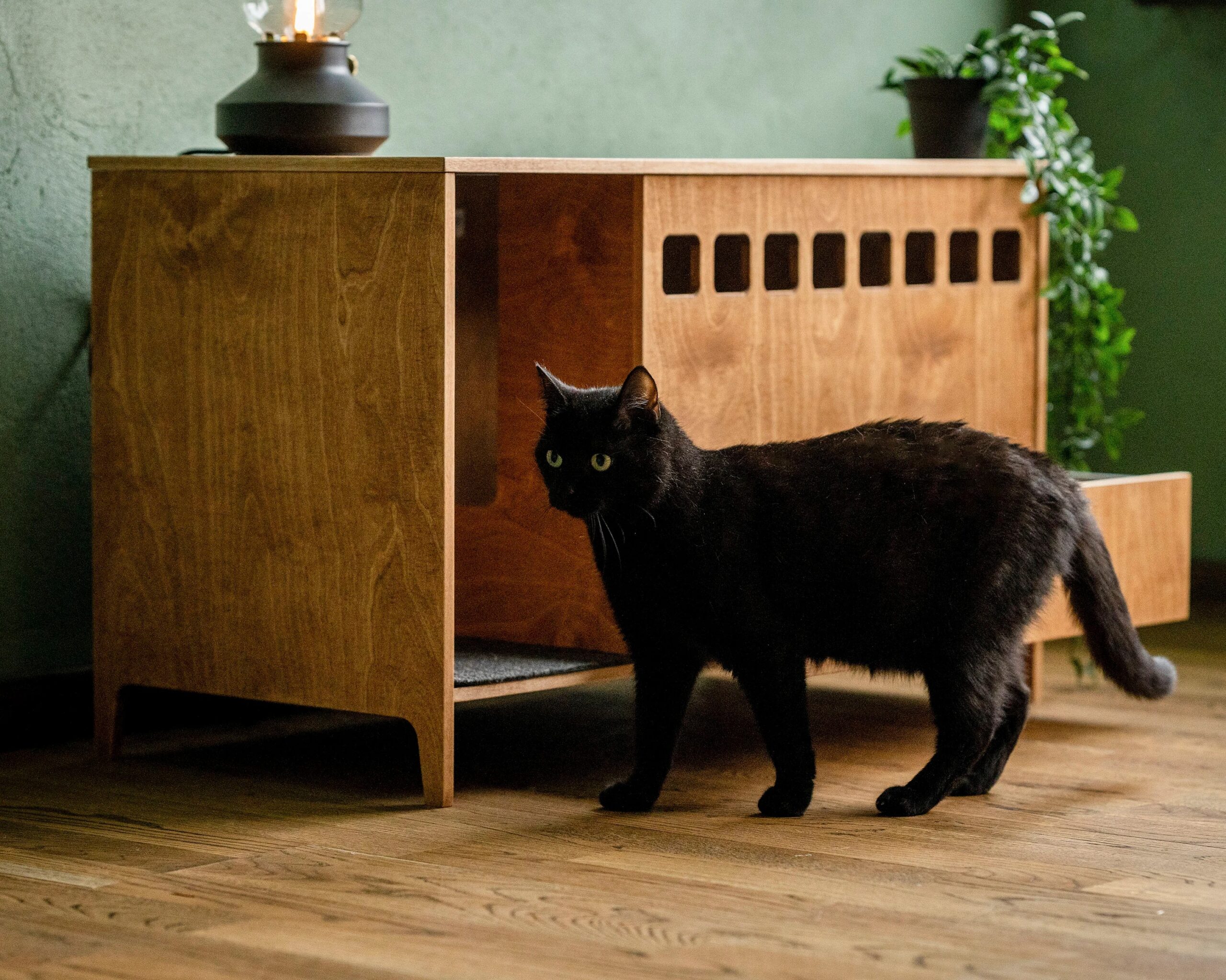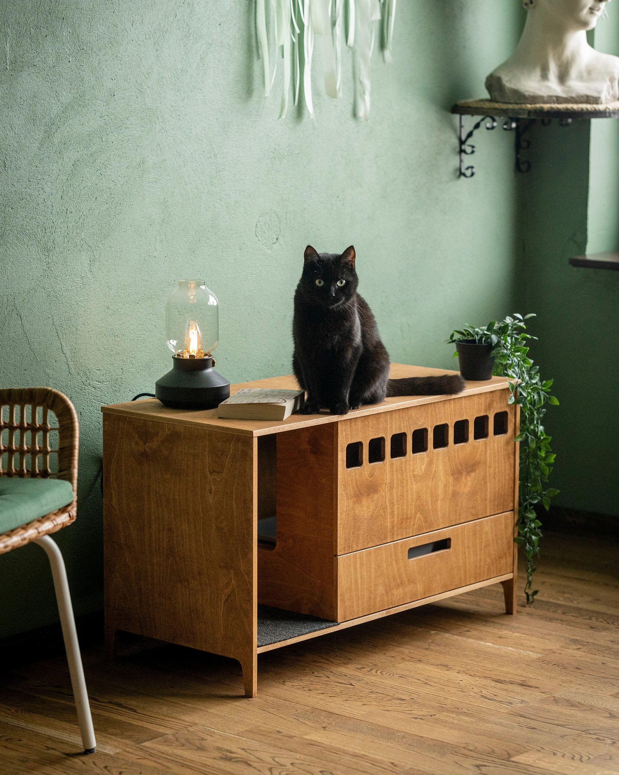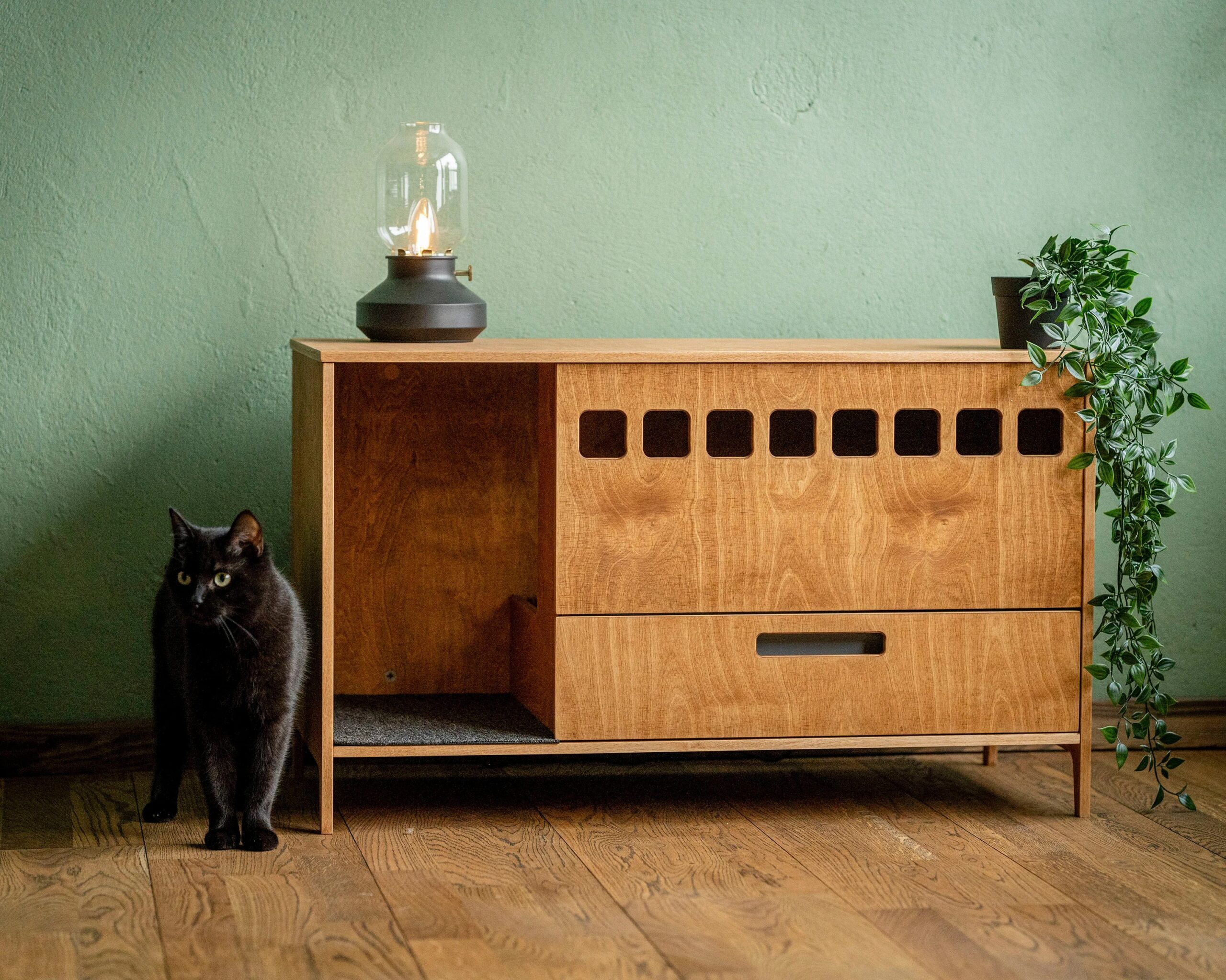 Introducing the Clean Cubby Litter Cabinet, a modern plywood cat toilet designed to keep your space clean, stylish, and completely litter-free. Handcrafted by House of Meows, this elegant piece doubles as functional cat furniture while blending beautifully with any modern home interior.