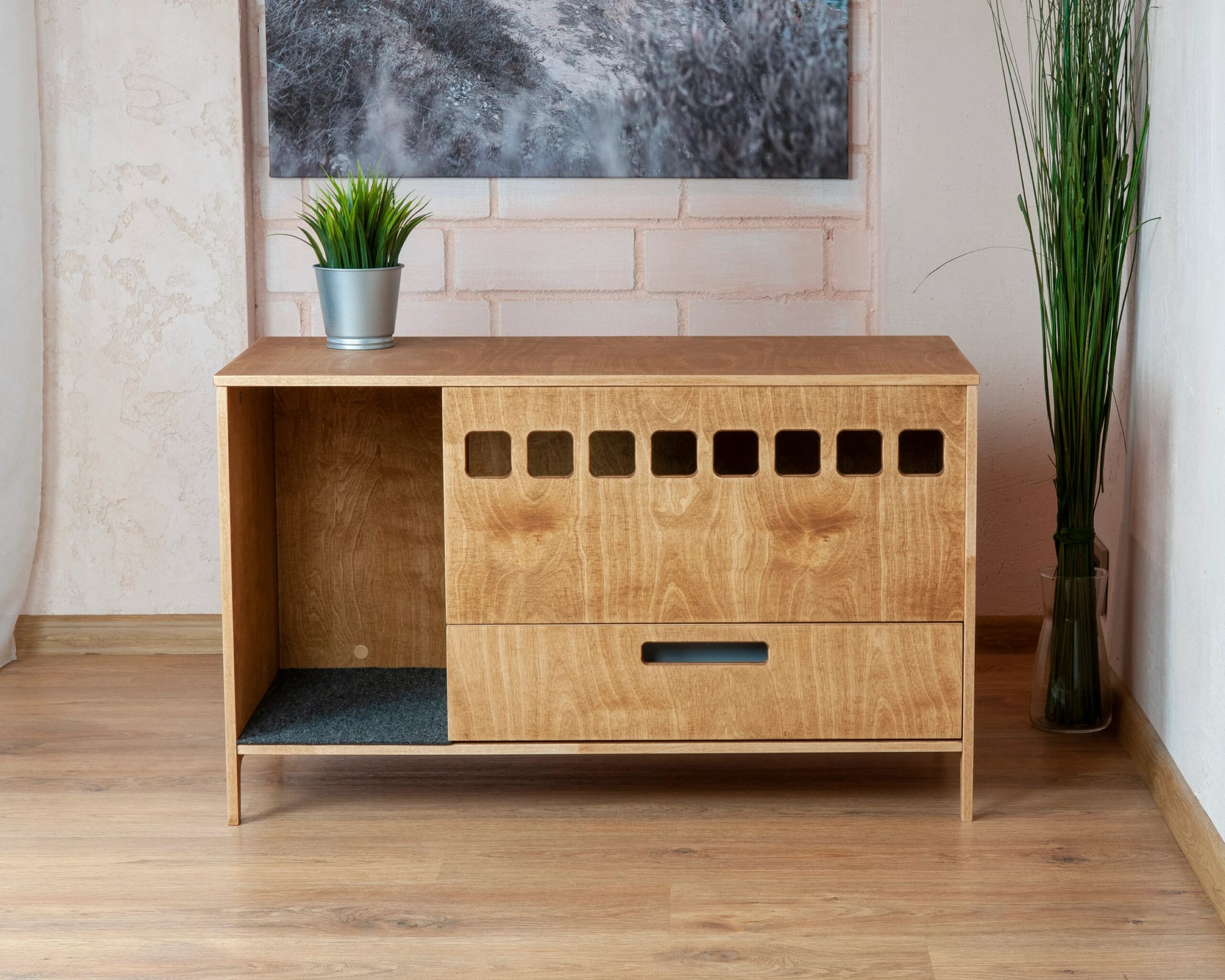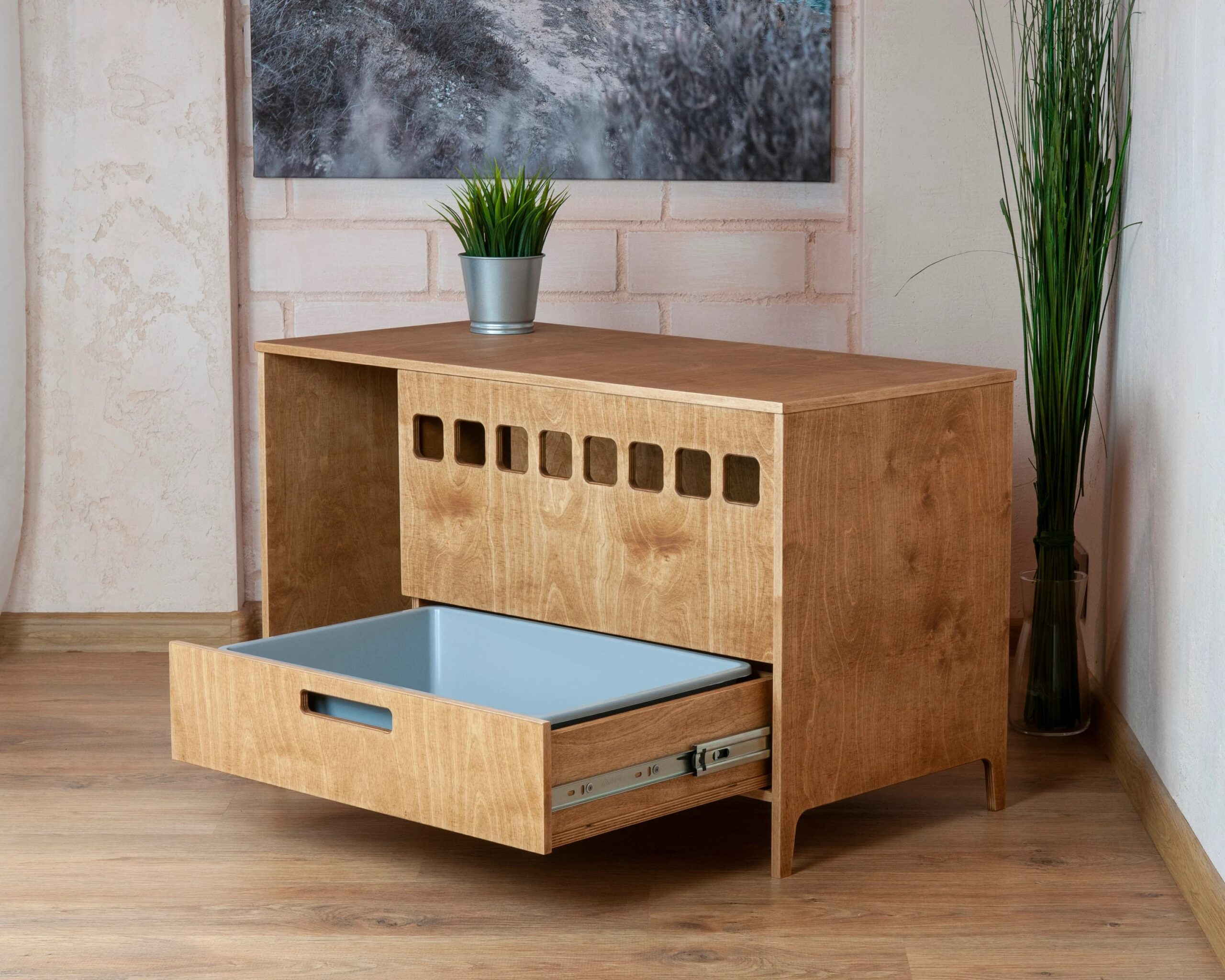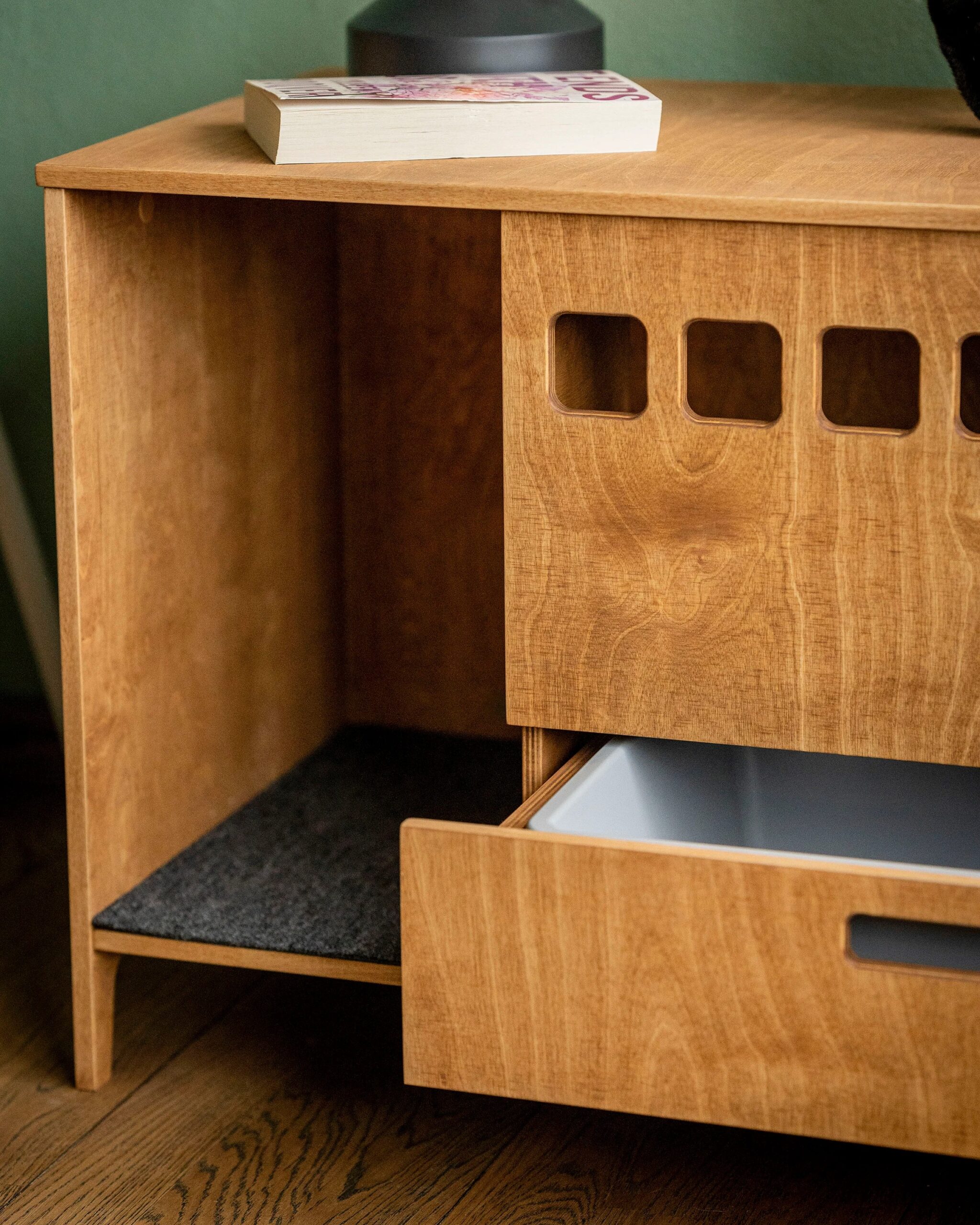 Introducing the Clean Cubby Litter Cabinet, a modern plywood cat toilet designed to keep your space clean, stylish, and completely litter-free. Handcrafted by House of Meows, this elegant piece doubles as functional cat furniture while blending beautifully with any modern home interior.