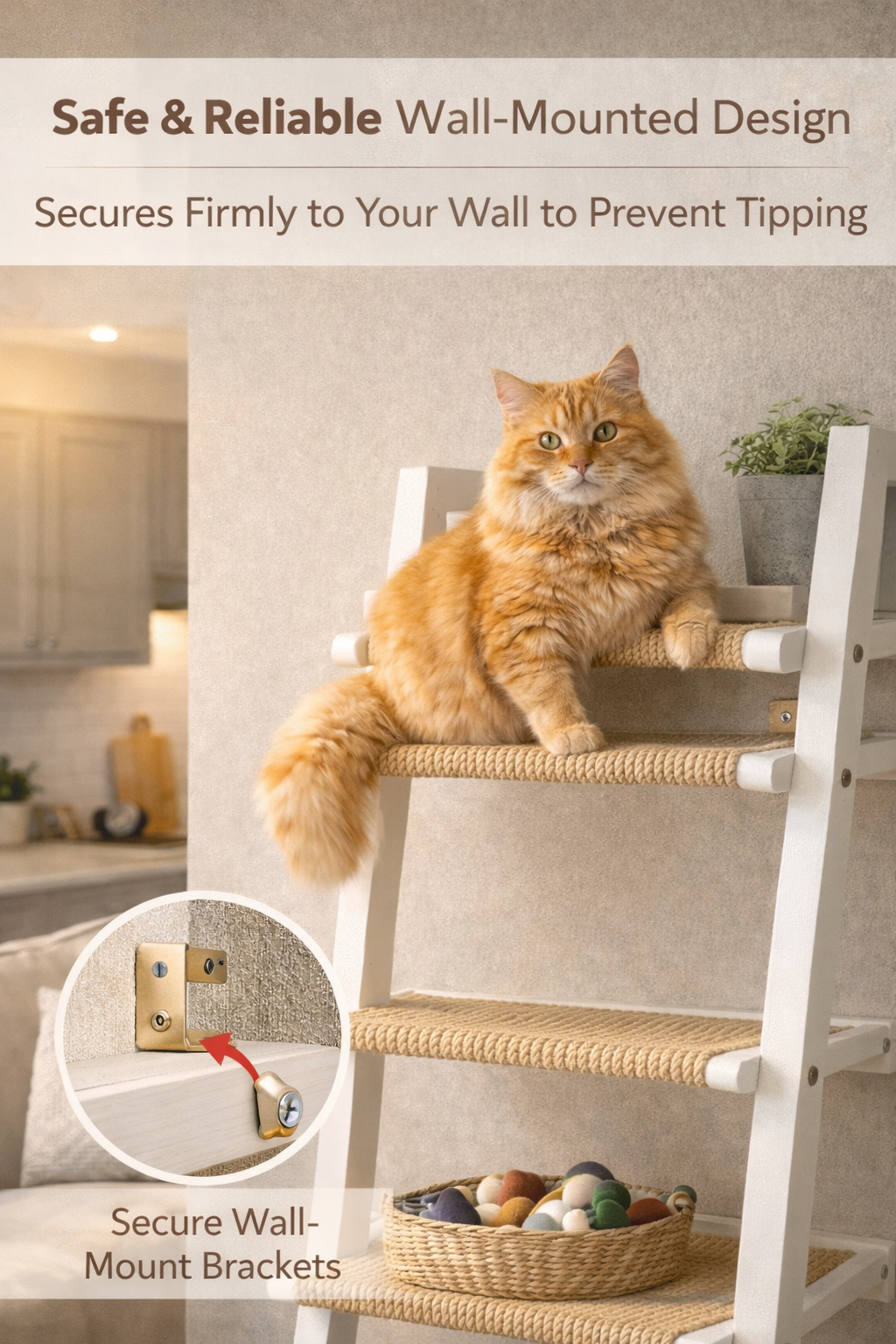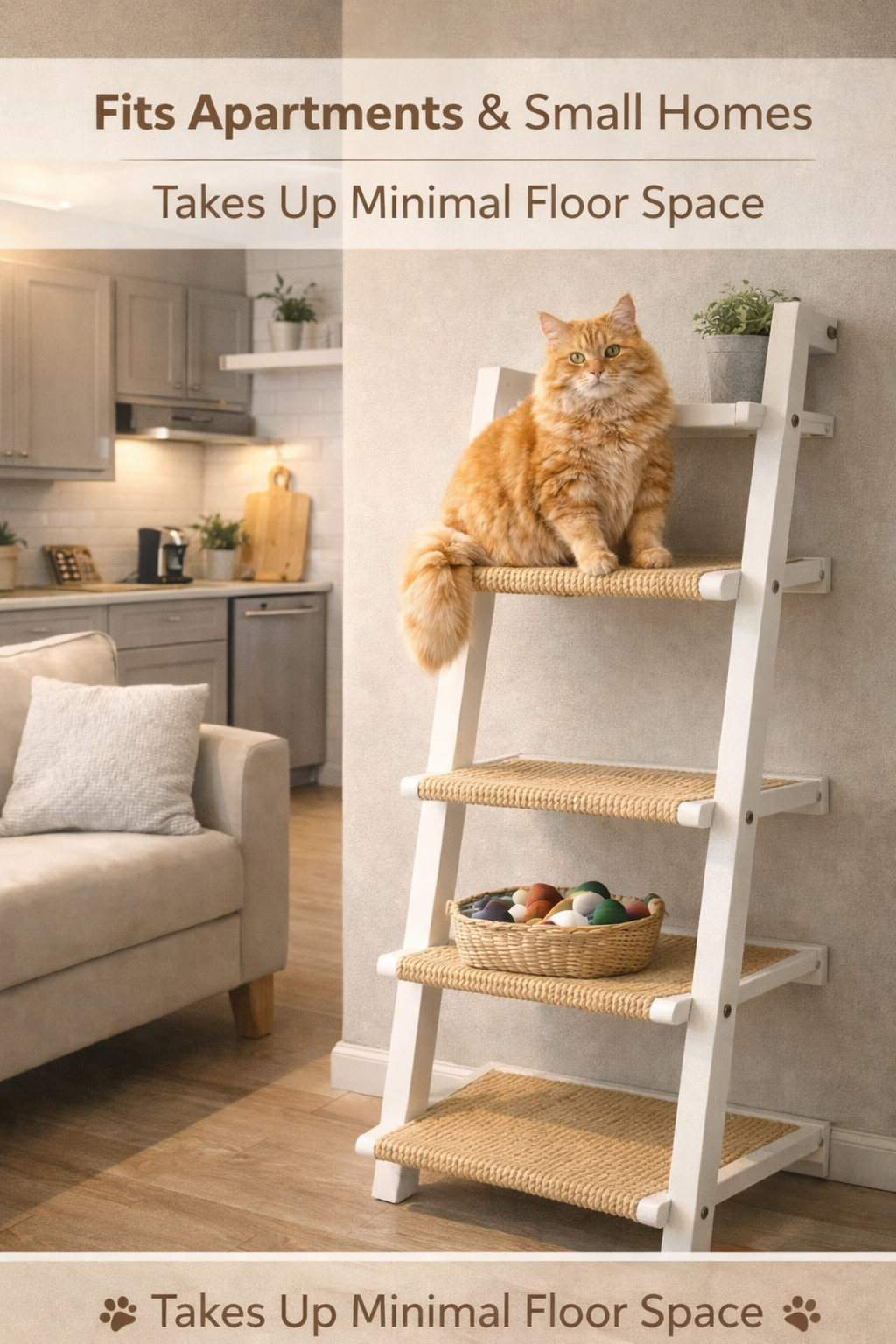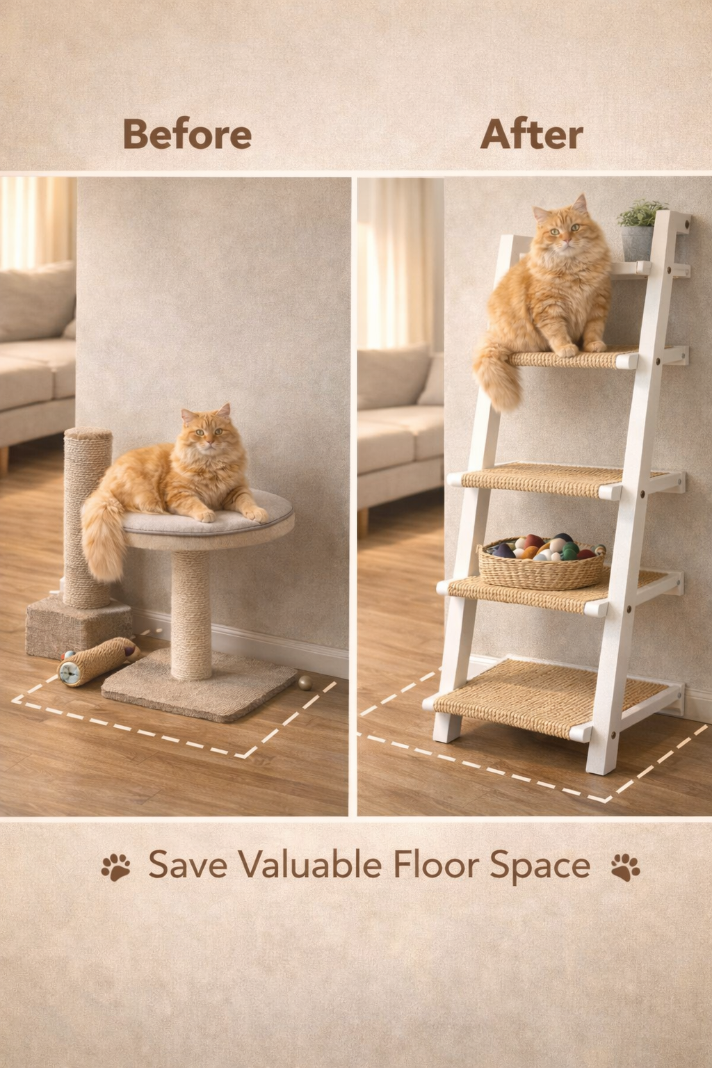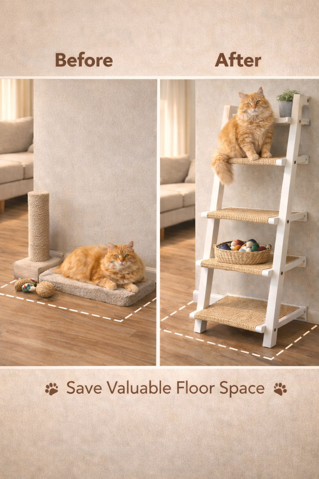 Unlike bulky floor cat trees, this ladder-style cat shelf uses vertical wall space, making it ideal for apartments, studios, and small homes. Each step is carefully spaced to allow easy climbing while ensuring stability and safety when wall-mounted.